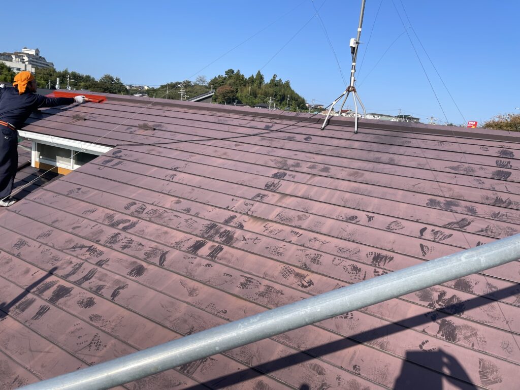 (屋根の下塗り、錆止めになります)