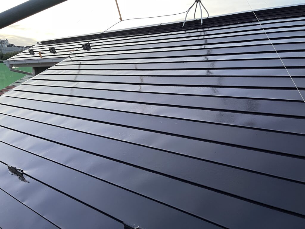 (屋根に新しい塗料を塗ってたところです、無機フッ素なので光沢がしっかりしており水をすごいく弾きます)