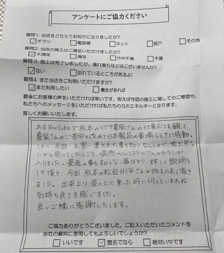 あるYOUTUBEで熊本のイグサ農家さんの仕事ぶりを観て、農家さんのご苦労を改めて日本製品の素晴らしさに感動。しかし、今回水害に遭われたことを知り、なんとか応援出来ないかと思っていたところに、偶然ベルシステムさんのチラシが入りました。畳表(たたみおもて)の事も知らないばかり、詳しく説明をして頂き、今回、熊本の松田州平さんの物を入れて頂きました。出来上がりの、畳の上に乗った時に何ともいわれぬ気持ち良さを感じました。 良いご縁に感謝いたします。