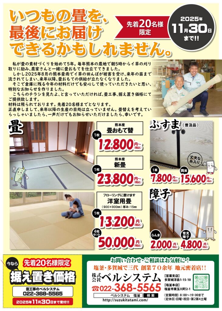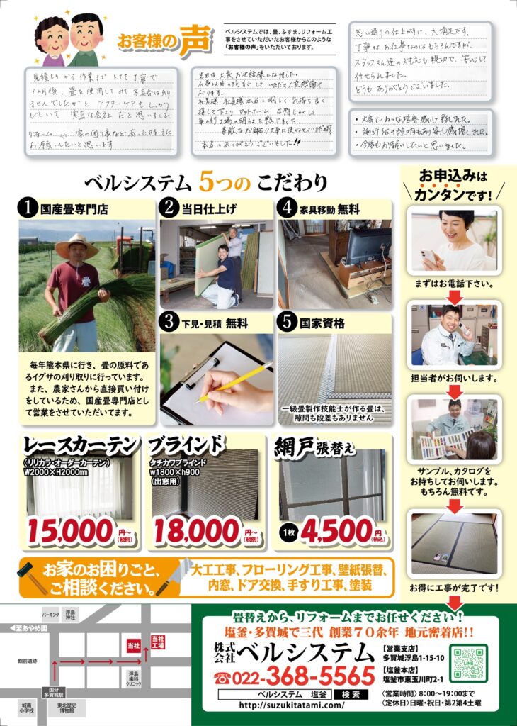 チラシには、当店の施工事例や、畳・ふすまの張り替えのビフォーアフター写真、お客様の声などが掲載されています。
