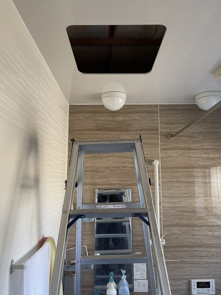 そこで、**脱衣所の分電盤からお風呂場の点検口を通してリビングに専用コンセントを新設**する工事を行いました。